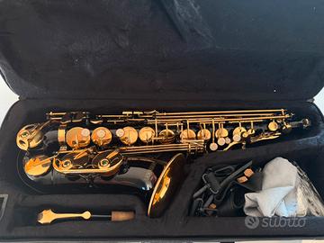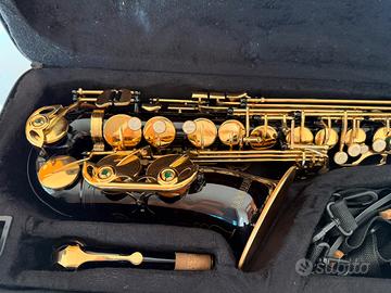 Sax saxofono o sassofono contralto mi b mi bemolle mib Strumento dal design moderno e scenografico, con finitura nera e chiavi dorate che lo rendono elegante e unico.
