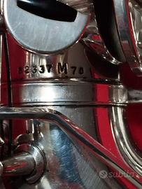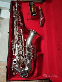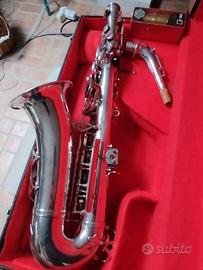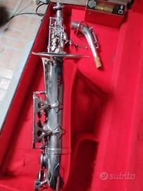 Sassofono contralto Vintage, Paul Destaurier, Paris Stensill della Dolnet modello M70 . Strumento artigianale placcato in argento, revisionato di recente, regolato, igienizzato, lucidato, cambiati dei tamponi, non tutti. Custodia rigida, Bocchino , levatura , copriancia e lacetto. Grazie per l'attenzione.