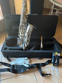 Vendo sax alto Gear4music AS-100N, usato pochissimo (circa 2 anni ma suonato raramente). Condizioni ottime: ✔ meccanica perfettamente funzionante ✔ tamponi in buono stato ✔ suono pronto, nessun intervento necessario ✔ normali segni minimi d’uso 🎷 Completo di: •custodia originale imbottita •bocchino Yamaha 5C •tracolla •accessori base •pacchetto ance Vandoren SR213 n.3 (quasi nuove, 9/10 disponibili) 👉 incluso tutto il necessario per iniziare subito a suonare ⸻ 🧵 MATERIALI •Corpo: ottone (brass) •Finitura: laccatura lucida •Chiavi: metallo nichelato •Tamponi: pelle sintetica con risonatori ⸻ Strumento ideale per: •principianti •studenti •chi vuole un sax completo senza spendere cifre alte Suono caldo, facile da suonare. Vendo per inutilizzo. “Usato pochissimo, sempre tenuto in custodia.”