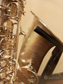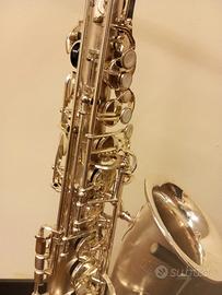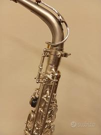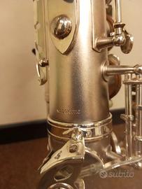Sax alto Ripa V-Jazz argentato sabbiato del 2010. Recentissima revisione con pulizia e parziale sostituzione dei tamponi. Si presenta pertanto in ottime condizioni.