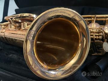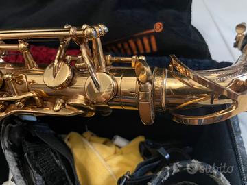 Sassofono contralto marca Wisemann, venduto con custodia a zaino/tracolla e qualche ancia di scorta.
