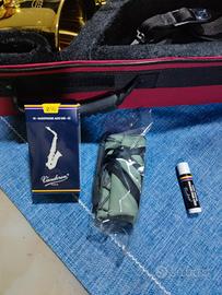 Vendo Sax Alysee utilizzato solo per prova e riposto in borsa, grasso per sughero, pacco di Ance Vandoren 2,5 ne manca una, panno con piombo per togliere l'umidità, bocchino Yamaha 4c. In più regalo flacone argento colloidale per disinfettare il bocchino. Vendo per inutilizzo, solo gli accessori pagati più di 50€.
