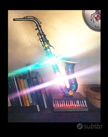 Bellissima lampada musicale realizzata utilizzando antico sassofono contralto e basamento in pietra. Pezzo unico.