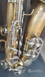 Sax contralto anni 60 Framez by Meazzi, costruito da Orsi o Grassi. Parzialmente slaccato dall'usura, revisionato e in buone condizioni di funzionamento. Con chiver, bocchino e custodia originale.
