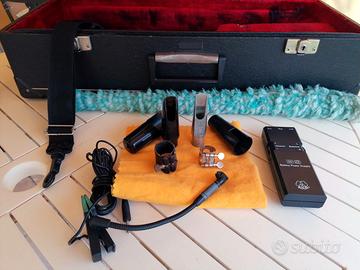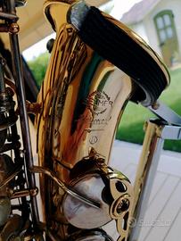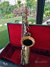 Sax contralto Selmer Mark 7, meccanica perfetta, sono presenti alcuni graffi sul corpo, alcune chiavi sono scolorite. A corredo: custodia rigida, collare, microfono AKG, bocchino Otto Link 8*, bocchino Dukoff 7*, 1 scatola ance nuove Rico, 1 supporto per sax.