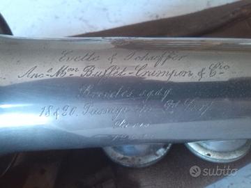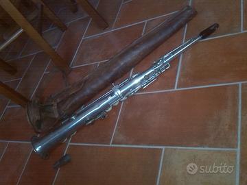 Vendo strumento come da foto con custodia originale in cuoio. Strumento da collezione, tuttavia la meccanica è completa e ritamponabile, becco originale, ossidazione minima e fisiologica, leggera compressione della campana, due piccolissime ammaccature. Altre foto su richiesta, grazie.