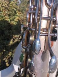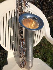 Vendo Sax Tenore Modello Ripa Serie Silver Satinato V-JAZZ Custom VI del 2011 in perfetto stato di conservazione. Come si può vedere dalle fotografie il modello è quello con chiavi, aste e interno della campana in argento lucido, mentre il corpo e il chiver hanno una finitura superficiale argento satinata. I tamponi e le molle in acciaio blu sono assolutamente in perfetto stato di conservazione poiché lo strumento è stato revisionato di recente.