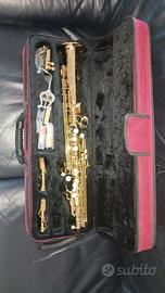 vendo sax soprano, pari al nuovo, con due cliver ,di cui uno curvo , bocchino con copri bocchino , collare, custodia ,letturino.