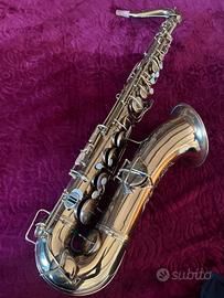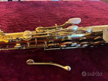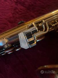 Sax tenore Conn New Wonder 1 del 1921 con rolled tone hole, il sax è stato rimesso a nuovo, cambiati tutti i cuscinetti, sugheri e feltri, ripassata l’incisione che si vedeva poco, applicata una piastrina piu ergonomica sulla chiave del sol#(l’originale rimane sotto ed è ripristinabile se si vuole). Sostitita con altra costruita artigianalmente la chiave del re#(foto 6), la nuova è più ergonomica con terminale a goccia a differenza dell’originale denominata cucchiaino da zucchero (che però conservo e fornisco), applicata piastrina alla chiave del mib mignolo sinistra per avvicinare la posizione dwl mignolo all’anulare altrimenti troppo lontana (anche questa reversibile).