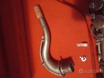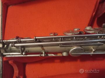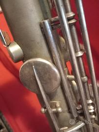 strumento completamente originale con fusto satinato, chiavi e inserti argentati. meccanica, mano sx diritta come nei sassofoni degli anni 30, non e' presente il becco. lo strumento si ispira al conn chuberry anni 30-40 con ampio volume di suono, sonorita' ricca di armonici medio gravi e con voce strumentale scura. lo strumento e' stato sbloccato, oliata la meccanica, qualche nuovo spessore di sughero, regolate molle, cuscinetti originali. e' stato anche lucidato senza stravolgere la sua patina, anche perche' l' ossidazione nelle chiavi e in parte nel corpo e' di difficile soluzione. lo strumento e' funzionante e con custodia originale