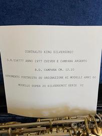 Saxofono king perfetto chiver e campana in argento massiccio, chiavi in argento, strumento revisionato e tamponato da Cardinali. Custodia restaurata come originale. Per prezzo: trattativa riservata lasciare messaggio solo se veramente interessati. Spedizione non a distanza, ritiro in loco