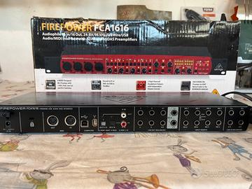 Vendo interfaccia audio professionale Behringer Firepower FCA1616, ideale per home studio e registrazioni multitraccia. La scheda audio è in buone condizioni. Qualche segno di utilizzo (vedi foto) Compreso: - staffe montaggio rack - alimentatore originale - manuale - adesivo giallo behringer - confezione originale Non compresi cavi di collegamento USB o firewire. L'unità è estremamente versatile grazie alla doppia connettività (USB e FireWire) e offre un'ampia gamma di ingressi e uscite. Caratteristiche principali: • 16 Ingressi / 16 Uscite totali. • 4 Preamplificatori MIDAS di alta qualità con alimentazione Phantom 48V. • Connettività USB e FireWire (compatibile con Windows e Mac). • Porte MIDI In/Out per collegare tastiere e synth. • I/O digitali ADAT e S/PDIF per espansioni future.