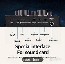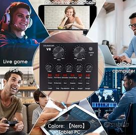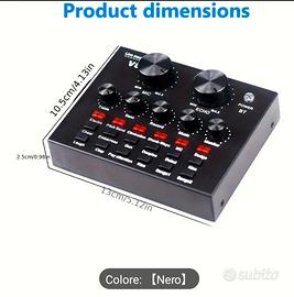 Auto alimentato con batteria interna scheda collegabile a microfono strumenti tastiera PC smartphone con effetto sonoro (applauso ecc) riverbero eco ecc. volumi entrate per microfono condensatore e non.