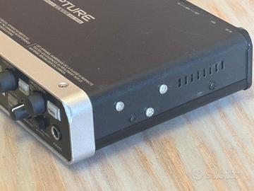 Include otto ingressi XLR combo per microfono/strumento, due uscite bilanciate TRS, otto uscite analogiche e uscite digitali S/PDIF e ADAT per espansione.