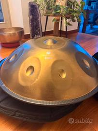 Vendo la mia Handpan della Sela in D Kurd. La zona tonale anteriore destra (la più piccola) ha una piccola ammaccatura (dimple). Il suono è leggermente influenzato, ma probabilmente per i principianti è quasi impercettibile. Vedi l'ultima foto.