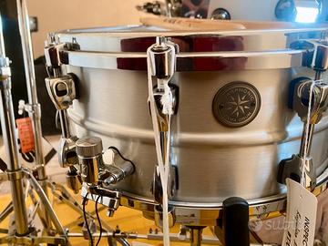 Fusti in legno multistrato (base acero) con suono equilibrato, ottima proiezione e risposta dinamica. Configurazione: cassa 22”, tom 10” e 12”, floor tom 16”, rullante 14”.