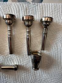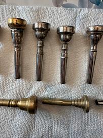 Vendo set di bocchini professionali per tromba. In totale 12 pezzi offerti in blocco. Getzen 7C B&S 7C Vincent Bach corp 7CWFL Vincent Bach 6B Vincent Bach corp 10-1/2C Spezial Bruno Tilz 12FE Stomvi 3C 1 bocchino artigianale 1 Prolunga 1 amplificatore Denis Wick. London (BOOSTER DI CONVERSIONE HEAVYTOP) 2 bocchini anonimi di cui uno nr. 3