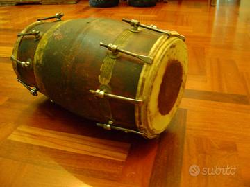 Set di 7 strumenti a percussione etnici (pelli) originali. COPPIA di percussioni in terracotta ( bongos dim: H 31 diam. 10 + 28); - MRIDANGA India a due pelli (acquistato da uno yoghi doc. fotografica dim. H 45 / diam. 22 e 20 una delle pelli è lacerata ma facilmente sostituibile);TAMBURO A CORNICE originale (diam. 32); DJMBE' piccolo( H 22 - Diam. 13); DARABUKKA piccolo ( H 22- diam. 11); altra percussione ( H 25 diam. 13); altra percussione (H 20 -diam. 19) ;
