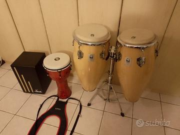 Vendo bellissimo set di percussioni, composto da: -2 congas della TOCA con Piedistallo professionali -1 djembe MEINL con pettorina Entrambi con tiranti a vite -1 cajon Disponibile alla visione e prova degli strumenti