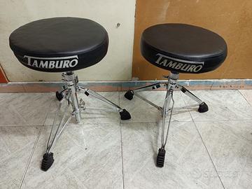 Vendo coppia di Sgabelli per batteria TAMBURO ad altezza regolabile con barra filettata dotata di ghiera di bloccaggio ad incastro per un fissaggio stabile e sicuro.