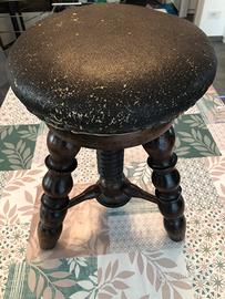 Originale con vite di legno e rivestimento della seduta in pelle. Misure: Altezza min/max 47/65 cm , larghezza appoggio gambe 36 cm, diametro sedile 30 cm.