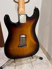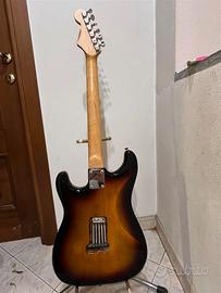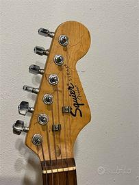 Chitarra elettrica Squier Stratocaster della serie Affinity prodotta nel 2005, il modello ST-100 in una bellissima tonalità di Sunburst. Presenta un difetto sulla parte frontale dove si è staccato un piccolo pezzo di vernice, per il resto è in ottime condizioni, il ponte a 6 viti e il battipenna ingiallito le donano un aspetto "datato". Possibilità di spedizione
