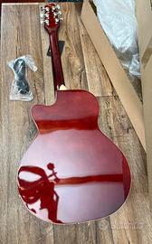 Chitarra acustica elettrica con forma auditorium, corpo in tiglio con finitura lucida, manico in nato e la tastiera in pioppo, spalla mancante consente un accesso agevole ai tasti più alti.