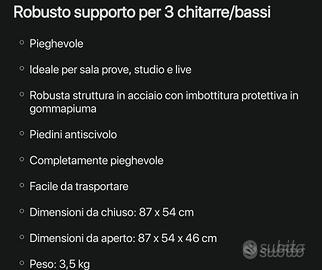 Supporto Stand per 3 chitarre, nuovo, tirato solo fuori dalla confezione e mai usato per progetto mai partito. misure e caratteristiche nella foto. Ritiro a Casalnuovo di Napoli.