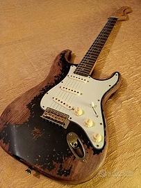 Stratocaster Natural Black finish Vintage hard heavy relic ,colore unico non replicabile, replica custom shop, body alder ontano, manico in acero maple, tastiera in palissandro rosewood. Meccaniche, ponte tremolo con hard block e switch originali Fender, Pickups Clarence Vintage artigianali fatti a mano, realizzati come le prime annate (fino al '60) " Magneti AlNiCoV, resa dinamica e timbrica analoga alle più vintage sincere, tutto il circuito vintage eseguito con cablaggi e potenziometri CTS USA, capotasto in osso, sonorità ritrovate da vera Vintage oltre ogni aspettativa, qualsiasi prova senza impegno con Fender d'annata sul posto e ampli adeguati Fender Vintage originali d'epoca, da provare anche con Strato Fender personali portate per comparativa. Prego non chiedere scambi o permute, non spedisco, si può provare sul posto senza impegno. Numero cell. whatsapp 3403010550 sito clarencepickups.