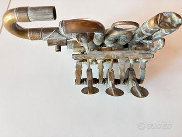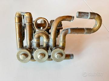 Questo oggetto è un blocco valvole (o meccanismo a pistoni/cilindri) smontato da uno strumento musicale a fiato in ottone, come una tromba o un flicorno. È composto da tre pistoni rotativi o valvole collegati da tubazioni in ottone, progettati per deviare il flusso d'aria e cambiare l'intonazione dello strumento. Tali componenti sono spesso realizzati con precisione tecnica e materiali durevoli Pezzo vintage di elevato design e modernariato Per collezionisti appassionati arredarori da esposizione in negozio bar locale storico Ritiro a mano gratis a Udine