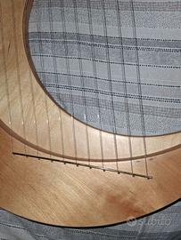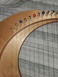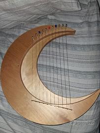 Piccola arpa a forma di mezzaluna. Strumento musicale con corde da pizzicare. Suonato pochissime volte e attualmente ha bisogno di essere nuovamente accordato. Non è un giocattolo e secondo me non è adatto a principianti assoluti. Consigliato a persone che hanno già una base con arpa o chitarra. Data la delicatezza dello strumento e la difficoltà di imballaggio, consegno solo a mano in zona Vigonza (PD) e frazioni.