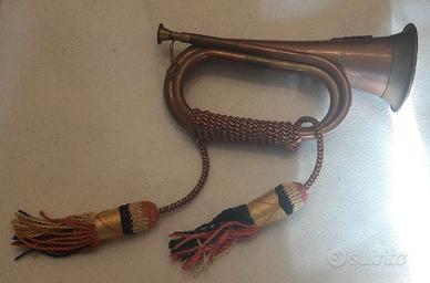 Tromba-Cornetta senza pistoni con gagliardetto colorato e stemma del "Royal Regiment of Artillery", stile XIX-XX secolo. Strumento da collezionismo. Spese di spedizione non incluse, oppure ritiro in loco senza spese.