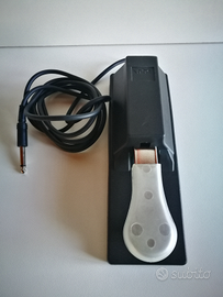 Pedale di comando a pulsante tipo "sustain". Il modello in oggetto è quello privo dello switch per il cambio di polarità (momentaneamente aperto o momentaneamente chiuso). Provvisto di cavo fisso di collegamento con jack mono. Il contatto avviene quando si preme il pedale e ritorna alla posizione iniziale quando lo si rilascia. Per tastiera piano yamaha, roland, akai, ecc.