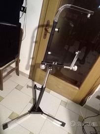 Come nuovo, utilizzato 2 o 3 volte, struttura in acciaio verniciato nero e cromato; robusto, stabile e resistente anche per strumenti pesanti, le ampie regolazioni permettono di utilizzare qualsiasi tipo di strumento sia seduti che in piedi in modo stabile e sicuro; la gomma morbida nei punti di supporto permette di rendere stabile e proteggere lo strumento, doppi supporti nel piano inferiore, utilizzabile anche in un punto vendita per esposizione o prova. Può ancorare strumenti di dimensioni massime, nei punti di fissaggio di 54cm x 25cm. Supporto artigianale così conformato è molto raro in quanto è realizzato in modo ottimale per strumenti professionali. Dimensioni d'ingombro chiuso: H 66cm Lu. 31cm La.26cm, tubo centrale di supporto D. 5cm, peso 8,5kg. Spese di spedizione tracciabili escluse, confezionamento rigido ad alta protezione, consegna a domicilio.