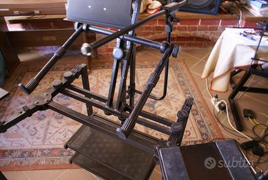 supporto per 2 tastiere , con 7 ripiani, tutto regolabie in altezza e 2 piani ruotano, porta microfono, leggio.