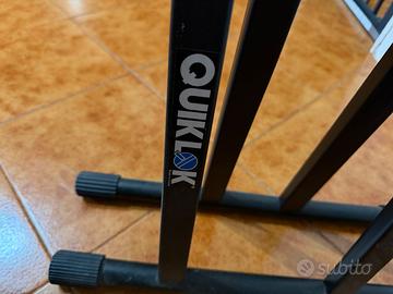 Supporto X Regolabile Doppia Tastiera Quiklok QL642 rappresenta la scelta professionale a livello globale per un supporto a 'X' a due livelli. Caratterizzato da un doppio telaio e un piano aggiuntivo che può essere regolato in termini di altezza, inclinazione, angolazione e profondità, offre una solida, versatile e affidabile soluzione per i musicisti. Grazie al suo originale sistema di bloccaggio a disco e al resistente doppio telaio in acciaio tubolare di 30 x 30 mm, garantisce una eccezionale solidità e supporto strutturale. I supporti della 'Pro Series' di Quiklok sono progettati per gestire anche le tastiere più pesanti, offrendo una tenuta sicura e stabile.