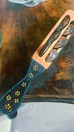 tamburello a mano (jingle stick) con sonagliere manico decorato in rilievo mai usato