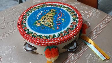 Questo specifico tamburello è realizzato in legno, decorato con una mappa della Sicilia che include le principali città e un bordo con passamaneria.