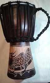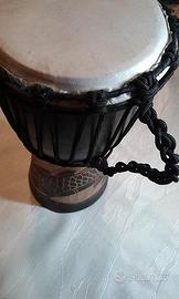 Tamburo djembe usato in buone condizioni. in legno, superficie liscia con pelle sintetica, adatto a suonare ritmi africani o come strumento didattico.