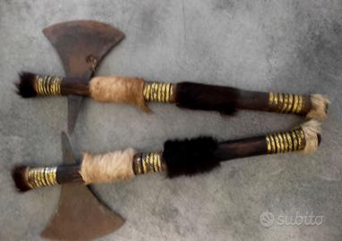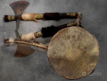 Come da fotografie, vendo 1 tamburo cerimoniale africano con vera pelle e 2 asce cerimoniali africane originali. Sono state acquistate oltre 40 anni fa in Marocco, ma la provenienza è più probabilmente subsahariana.