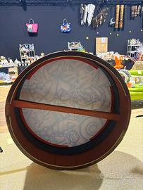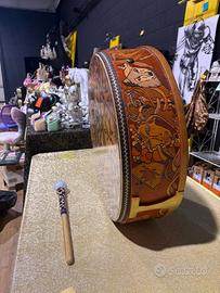 Tamburo tribale con decori tutto fatto a mano con custodia e mazza apposita per suonarlo.