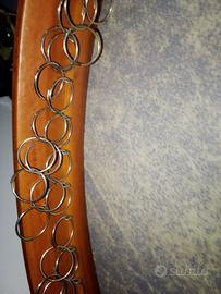 Tamburo etnico (DAF - medio oriente) a cornice con sonagli, marca 'SAMA BP'. La pelle è sintetica. Risulta leggermente ovalizzato.