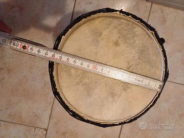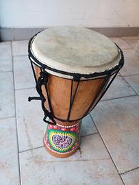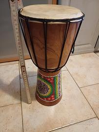 Tradizionale tamburo africano tipo gong in pelle di capra ed in legno massello intagliato a mano con un disegno tribale.