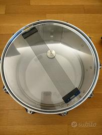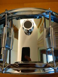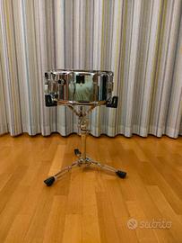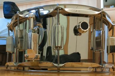 Tamburo rullante di marca Arware in metallo cromato liscio, ottime condizioni, usato poco, con possibilità di attivare o disattivare la corduera tramite una leva laterale (visibile in foto). Prezzo originario 110€. Supporto treppiede per reggere il tamburo (nella sesta foto )presente sul profilo.