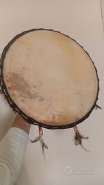 Ornameni della cornice: perline in legno e in plastica con piume; tiranti in legno.
