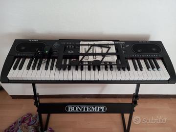 Tastiera Bontempi con leggio, libretto di istruzioni, cavo alimentazione e supporto.