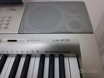 Tastiera Casio LK-270, usata in ottime condizioni, completa di copri tastiera, microfono per cantare e registrare campioni da suonare, tastiera che si illumina per imparare a suonare. Lezioni di diverso livello con diteggiatura e si avanza quando si suona bene quella parte.