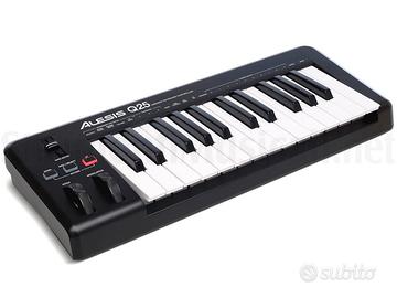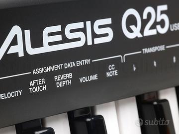 Alesis Q25 è un controller USB/MIDI a tastiera sensibile alla dinamica, completo e compatto da impiegarsi sia nelle postazioni di produzione musicale computer based, sia in studio di registrazione e dal vivo grazie alla presenza di una porta MIDI Out, la quale permette l'integrazione di strumenti MIDI hardware esterni. Q25 è una soluzione realmente plug 'n' play sia nella forma, sia nell'utilizzo pratico: collega il cavo USB al tuo computer MAC o PC e suona il tuoi strumenti virtuali preferiti. L'alimentazione arriva direttamente tramite la porta USB e nessun driver deve essere installato per far funzionare la tastiera. Q25 è equipaggiata anche di wheel per il controllo del pitch bend, modulation, di un fader per l'invio di messaggi MIDI CC e dei tasti retro-illuminati up e down per la selezione delle ottave. Inoltre, potrai inviare anche messaggi di MIDI Program Change per cambiare al volo la patch, il preset dello strumento che stai suonando. Nonostante le ridotte dimensioni e la semplicità del layout, la Q25 offre numerose funzioni di programmazione MIDI raggiungibili mediante combinazioni di tasti, che strizzano l'occhio agli utenti esperti alla ricerca di una soluzione compatta, leggera e trasportabile. Grazie alla porta fisica MIDI Out, Q25 funziona anche come interfaccia MIDI, permettendoti quindi di controllare eventuali strumenti hardware esterni presenti nel tuo parco macchine.