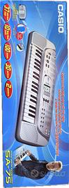 La mini-tastiera SA-75 offre a tutti i giovani tastieristi 100 timbri di alta qualità e 30 pattern (10 ritmi, 10 sessioni libere, 10 funny), oltre ad un sistema d'informazioni musicali tramite LCD e la possibilità di disattivare con "Melody off" la melodia dei 10 brani in dotazione per suonarli da soli. Caratteristiche 37 minitasti Polifonia a 4 note (max) 100 timbri 30 pattern: (10 ritmi, 10 sessioni libere, 10 funny) 10 brani d'esercizio Display LCD Ingressi e uscite: ingresso microfono, cuffie Usato funzionante con confezione originale. funzionamento a batteria e con alimentatore universale (non incluso). Richiesta 50 euro