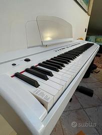 Colore bianco elegante, completa di portaspartito, cavalletto e scatola originale per un trasporto sicuro.